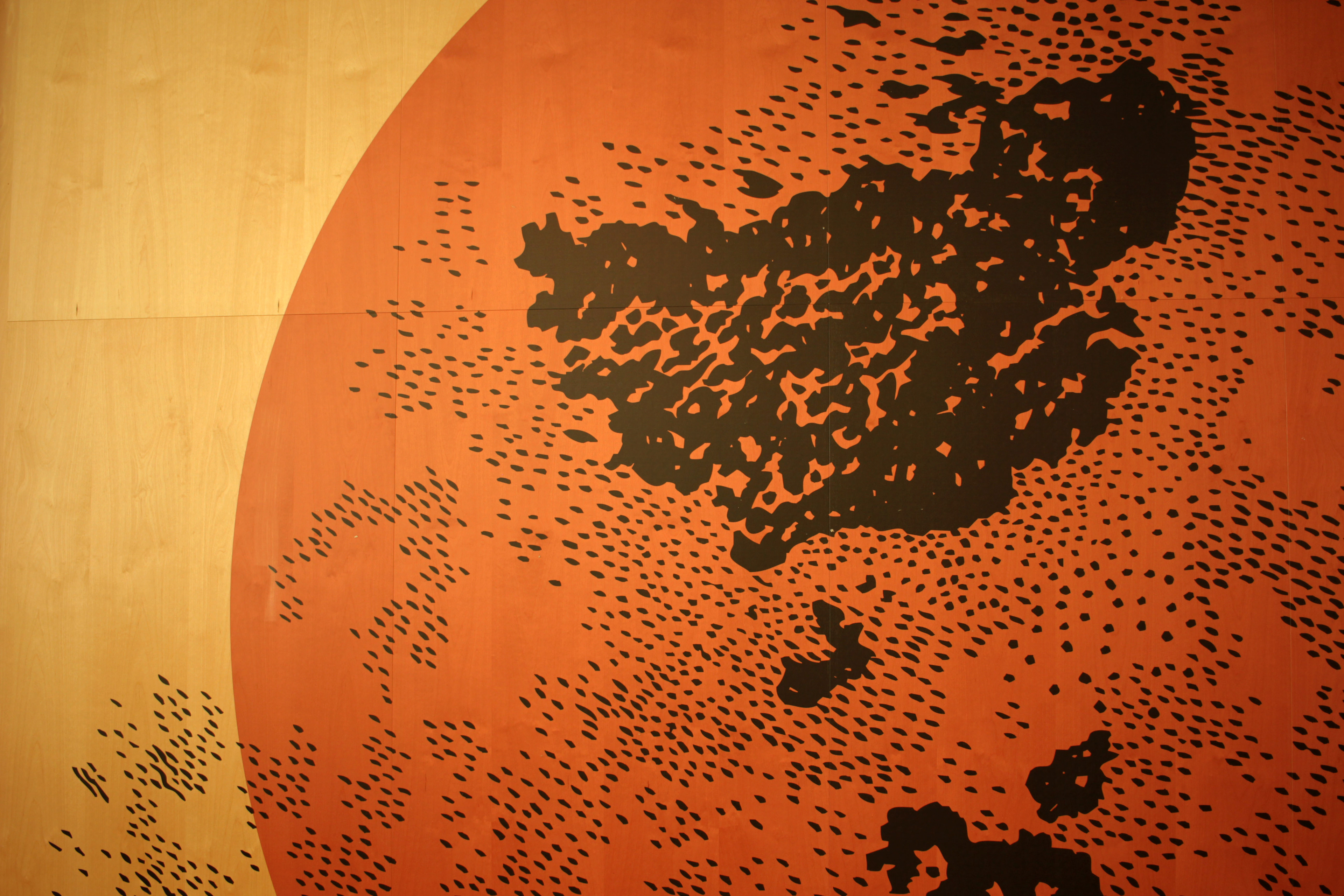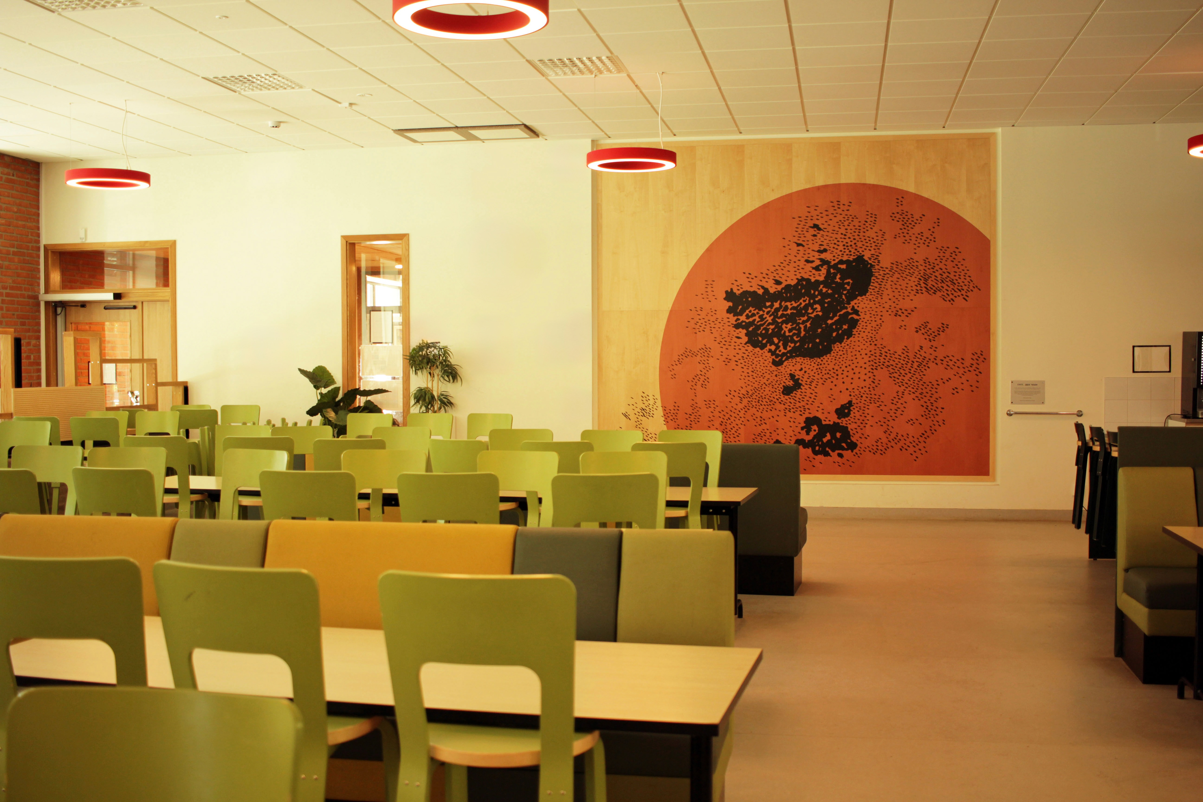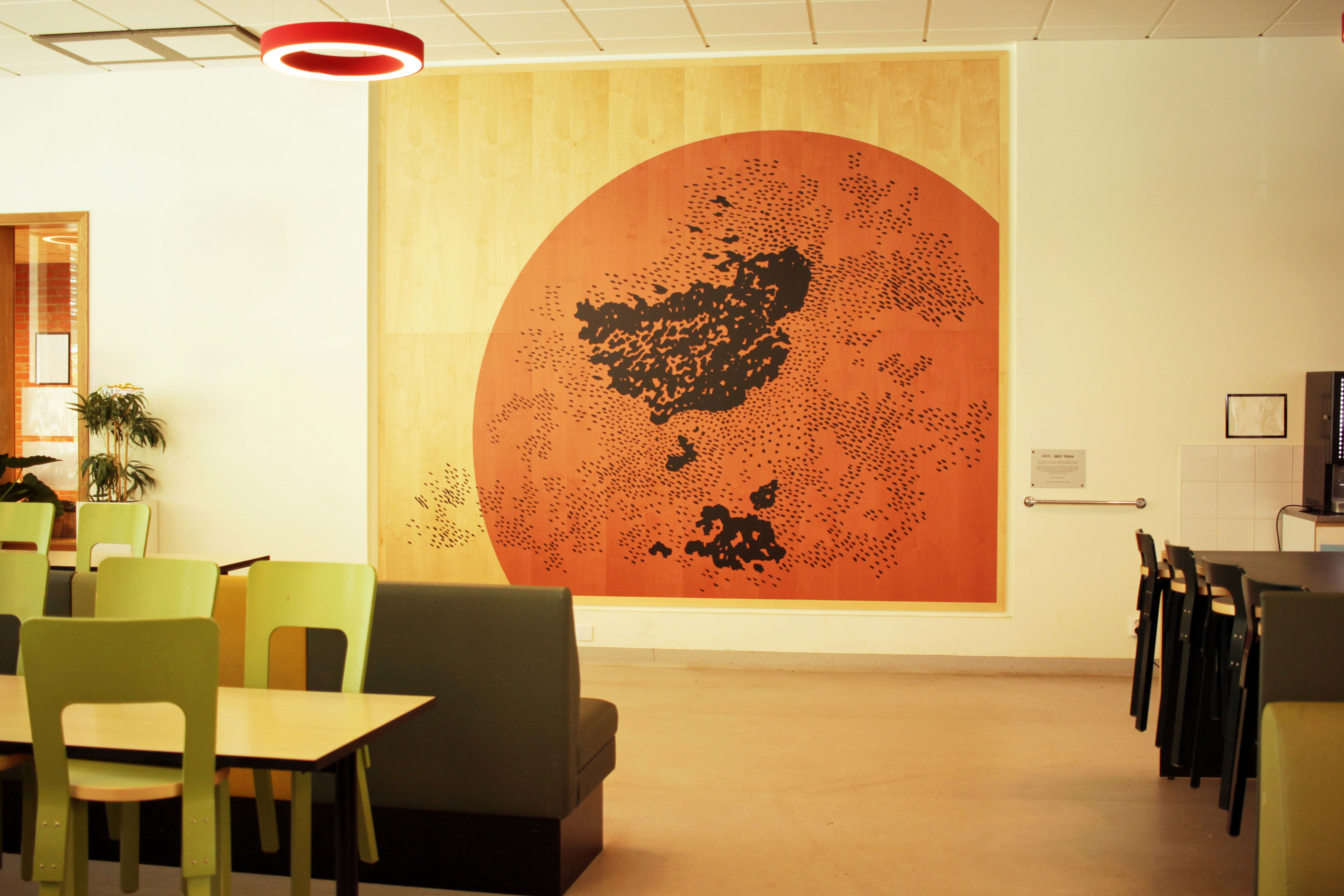 Screen Print on nanoperforated birch acoustic panels 3.00m x 3.50m. Dinning Hall, Ryaskola, Gothenburg 2022.